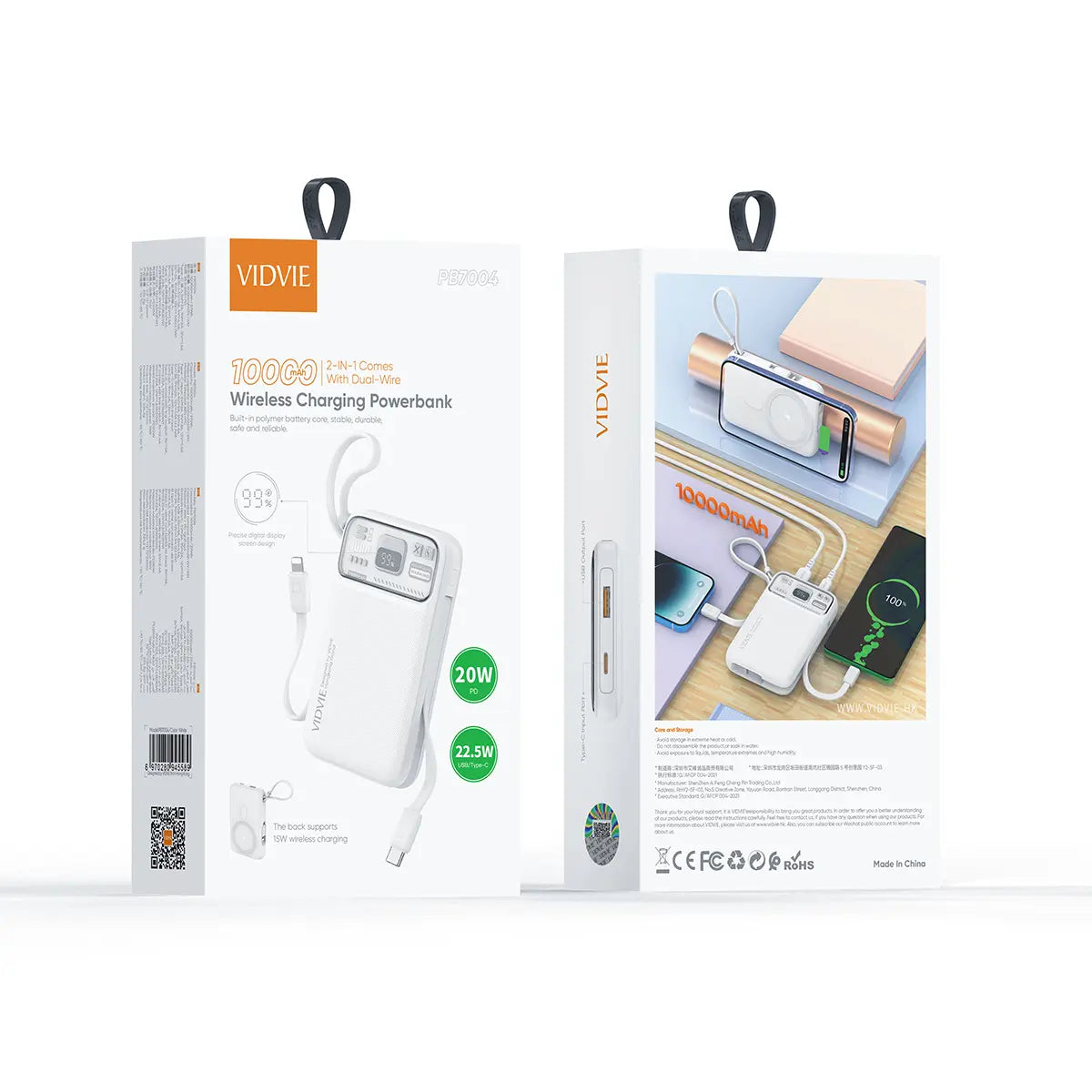 Powerbank Vidvie PB7004 de 10000mAh con carga inalámbrica rápida y cables integrados para iPhone y Android.